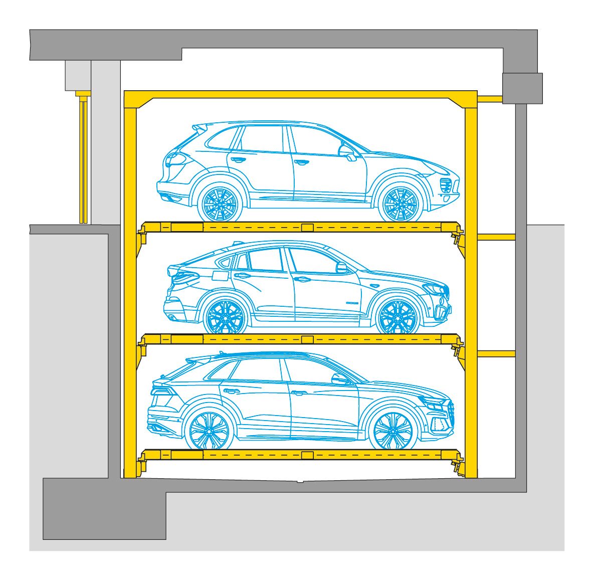 The Combiparker 560 offers a variable parking space concept with up to five parking levels, providing unrivalled flexibility with the ability to build four levels up or four levels down from the entrance level. With a standard underground car park floor height of 2.50 metres, this system maximises space savings by allowing up to four levels below ground, making it one of the most versatile parking solutions available. The Combiparker 560 can accommodate a wide range of vehicle sizes and offers up to 750 layout options. In addition, all parking bays can be equipped with charging stations for electric vehicles, further supporting sustainable initiatives.