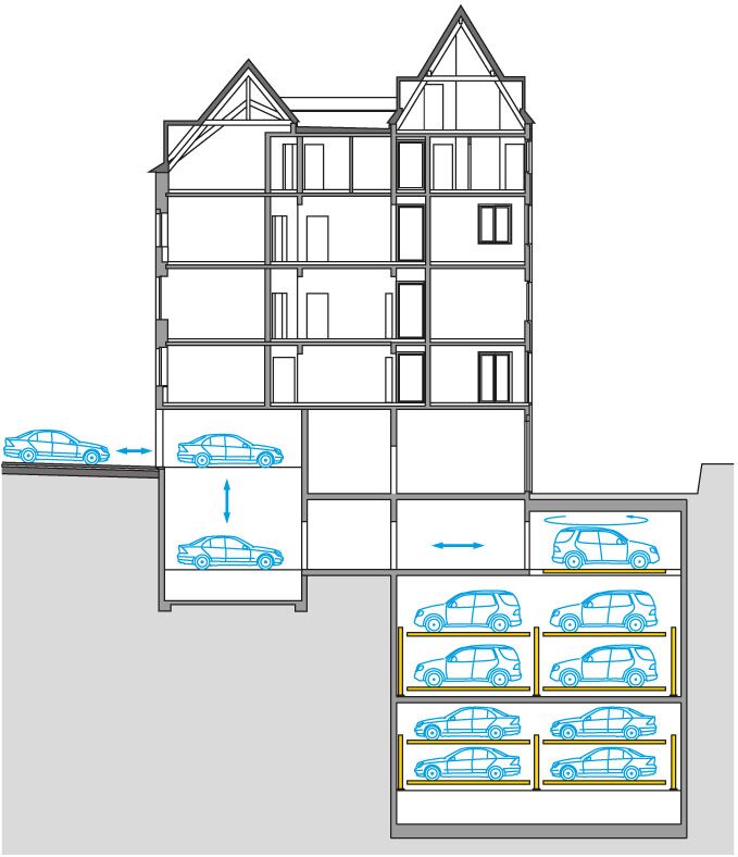 The Conseil d'Etat and Clinique St. Joseph buildings, located in the heart of Luxembourg's old town, were converted and renovated under strict adherence to architectural and historical requirements. The automatic parking system is entered at sublevel 2 via a car lift. This system features 2 rows of parking spots located behind each other on the right and left sides of the vertical conveyor, which has a long shaft to reach the top of the facility. A shuttle rests on the conveyor and moves the cars to both bays. To maximize the restricted space available, 3 parking places are arranged next to each other per bay and level. The conveyor system and software park the cars safely and reliably.