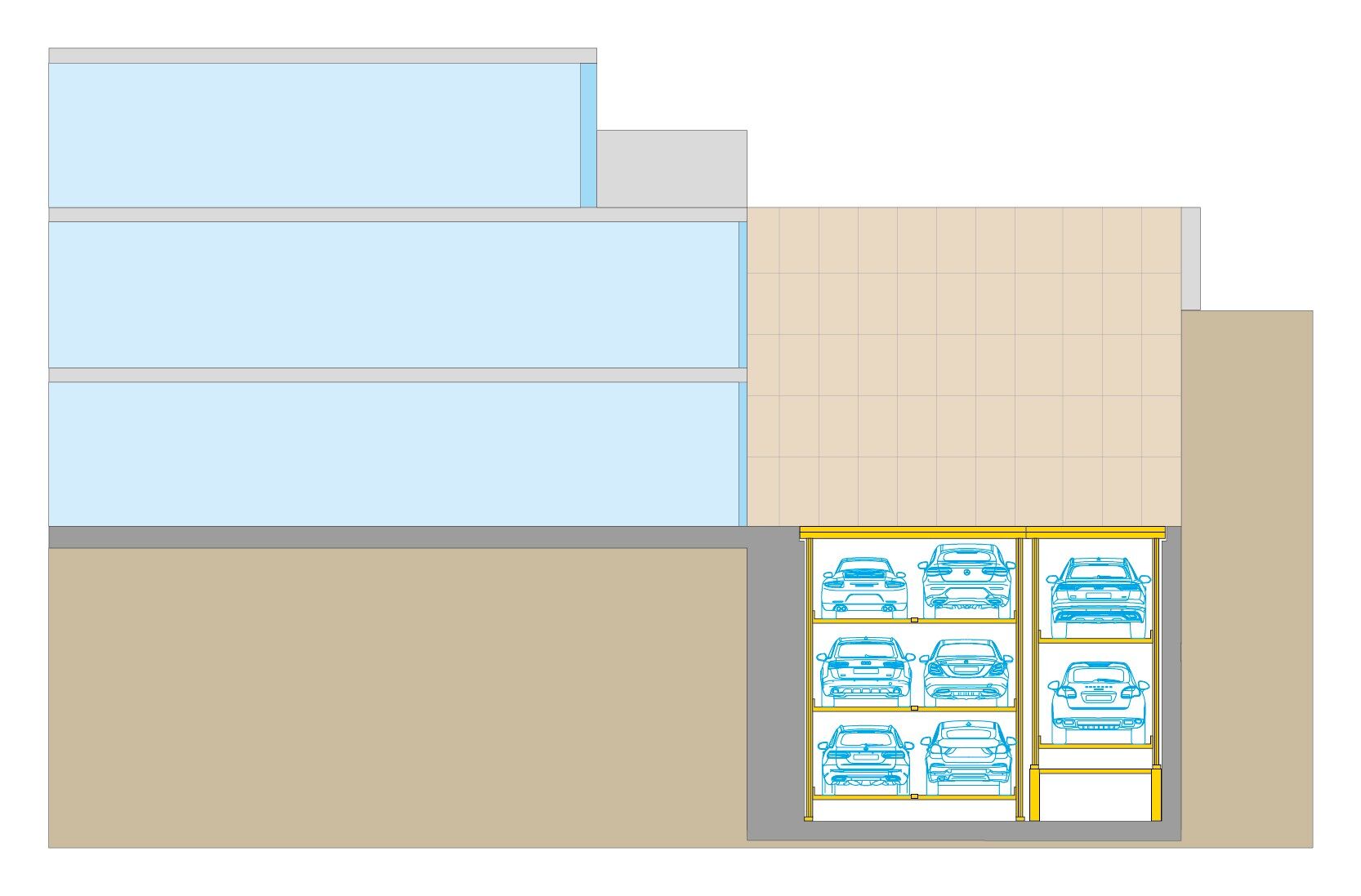 The building is indeed a prime example of energy-efficient, environmentally-friendly construction. Room ventilation and air conditioning, for instance, are run on geothermal energy (geothermal heat) and solar thermal energy (solar power). A new space and energy saving parking space solution is also part of the renewal concept. Due to the climate conditions in Madrid, a solution was required, which functions underground and is integrated into the air conditioning cycle of the building. It was decided to use WÖHR as an innovative partner for this challenging task. Two retractable mechanical double parking lifts of the model range 463-2,0 D with twelve parking spaces on three levels and one individual parking lift 462-2,3 E with two parking spaces on two levels were chosen. You can drive to the parking levels horizontally.