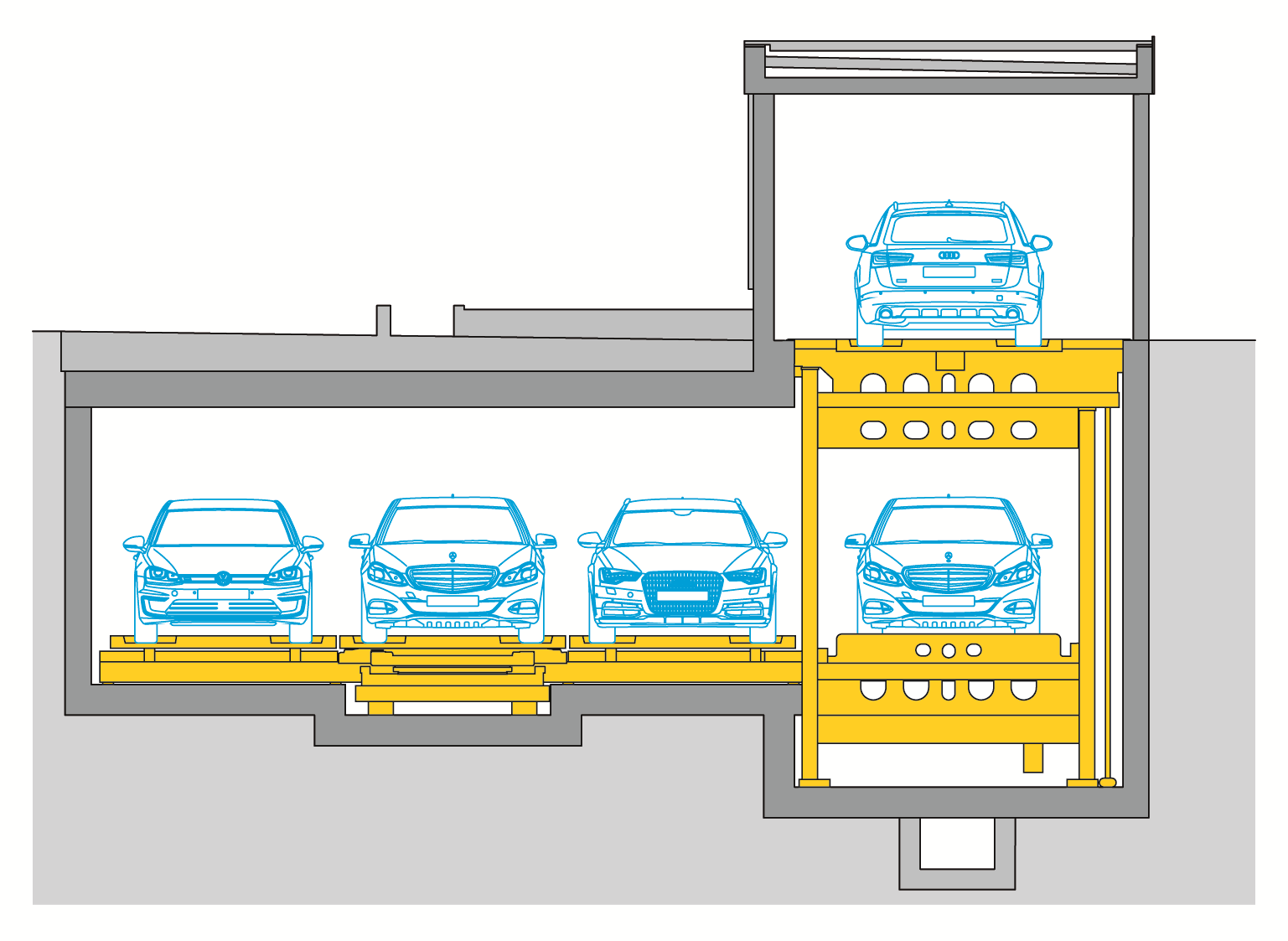 The user starts the parking process at the control panel using an RFID chip. The gate opens and the car can be parked on the parking platform. Here, the vehicle is measured by scanners to ensure that the vehicle has been parked correctly. After confirmation on the control panel, the gate closes and the vehicle is lowered, turned and stored in the direction of travel.