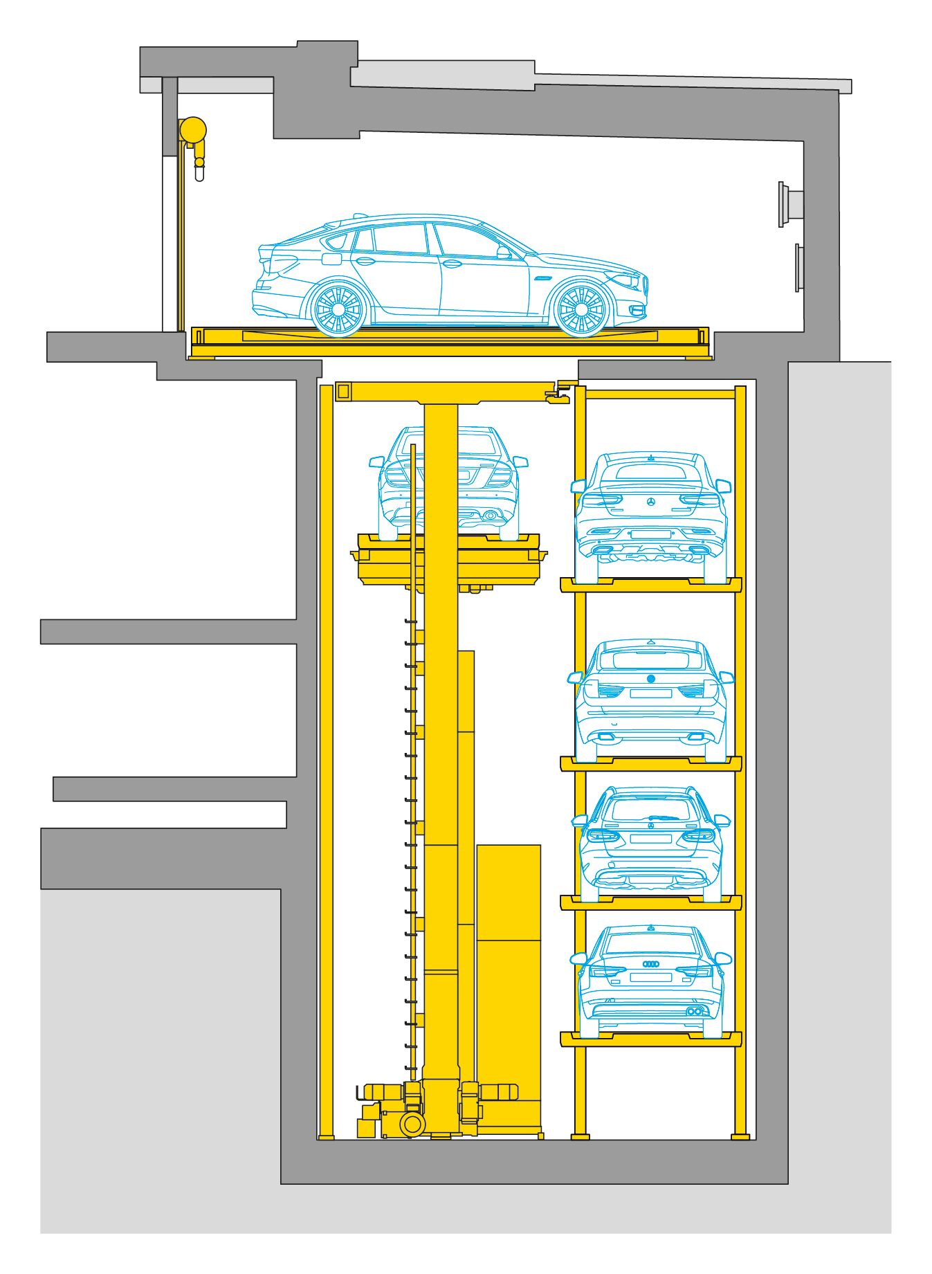 - 4 parking levels, each with 7 parking spaces