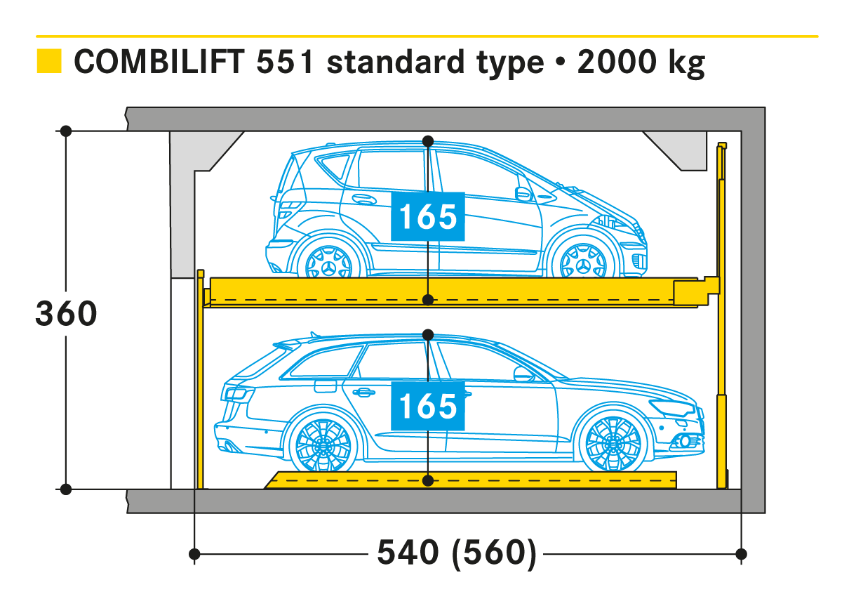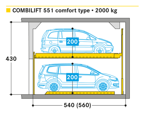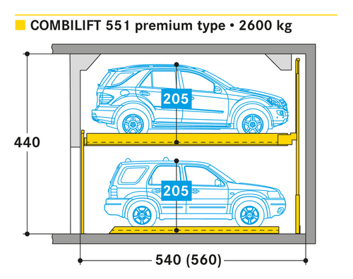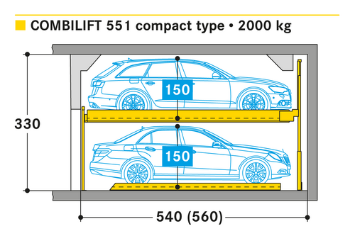 Combilift 551: parcare independentă pe 2 niveluri, unul peste celălalt, fără puț. Prin ridicarea și translația platformelor se obține acces direct la toate locurile de parcare de la nivelul de intrare.