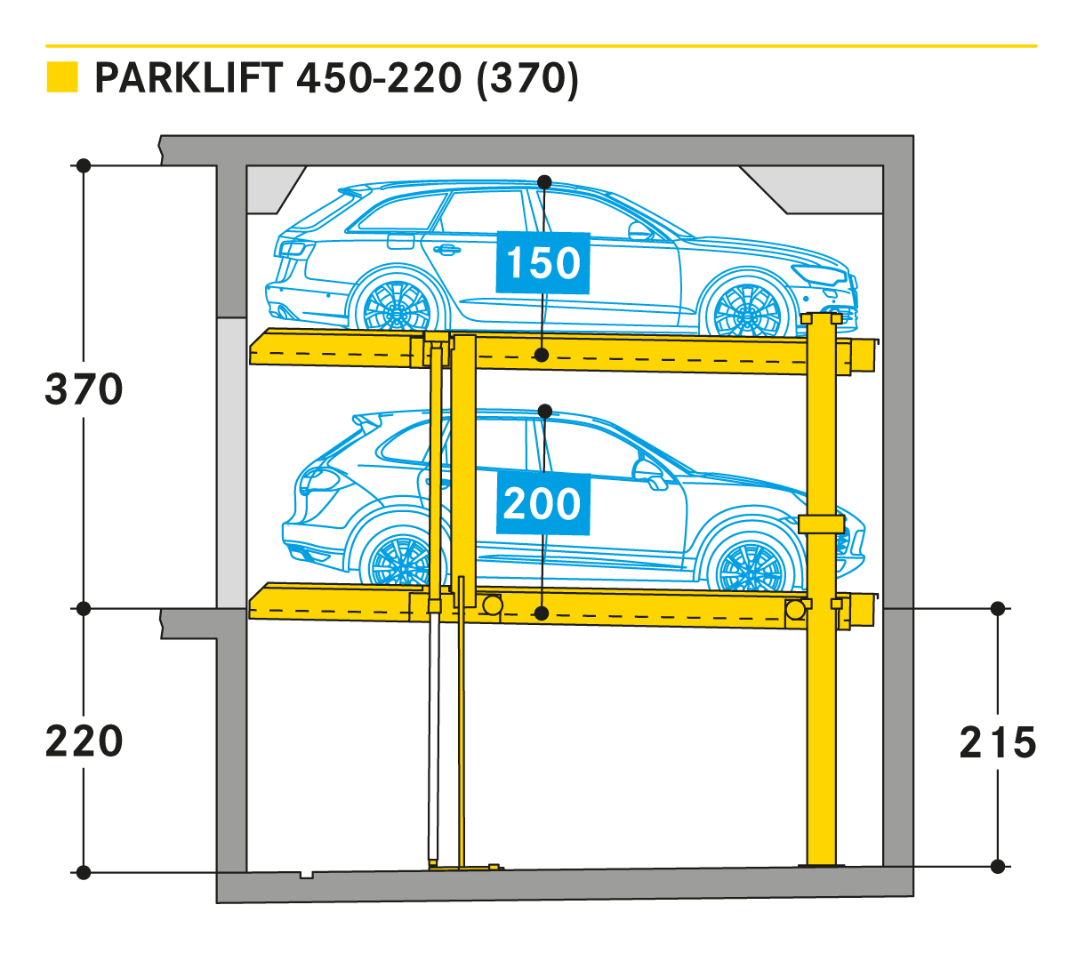 Sistem de parcare Parklift 450 oferă, de asemenea, o flexibilitate maximă a dimensiunilor de instalare. Tendința este de îndepărtare de la configurația rigidă, cu trepte de creștere de 15 cm a spațiului liber în ceea ce privește adâncimile puțului, și de îndreptare spre o flexibilitate sporită a spațiului liber. De fapt, adâncimile de puț nou proiectate asigură creșterea spațiului liber în trepte de 5 cm. În comparație cu modelele predecesoare, sistemul Parklift 450 oferă o înălțime liberă cu 5 cm mai mică, fără nicio reducere a înălțimilor standard ale autoturismelor. Cum este posibil acest lucru? Modelele anterioare erau prevăzute cu o platformă ridicată pentru drenarea apei care se acumulează în locurile de parcare, apa scurgându-se de pe platformă în canalele de scurgere. Sistemele recent dezvoltate au eliminat ridicarea și au rezolvat problemele de scurgere prin înclinarea ușoară a platformei, oferindu-i o înclinare minimă de 2%. Sistemele simple sunt proiectate pentru 2 autoturisme și cele duble pentru 4 autoturisme.