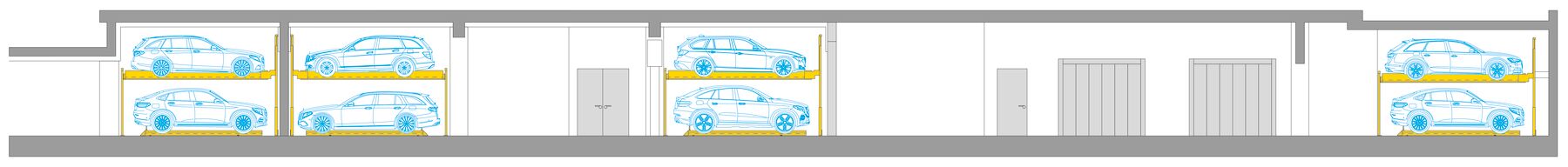 La subsol a fost construită o parcare subterană comună cu aproape 100 de locuri de parcare, accesibilă prin intermediul a două lifturi pentru mașini. Toate locurile de parcare au infrastructură de încărcare pentru autoturisme electrice. Cincizeci de locuri de parcare sunt aranjate într-un mod care economisește spațiu în patru sisteme semiautomate WÖHR Combilift 551. Spațiu suplimentar este disponibil pentru partajarea autoturismelor. Raportul redus al locurilor de parcare de 0,4 per unitate rezidențială și utilizarea sistemelor compacte WÖHR susțin strategia de mobilitate durabilă a cartierului și contribuie la reducerea costurilor de construcție.