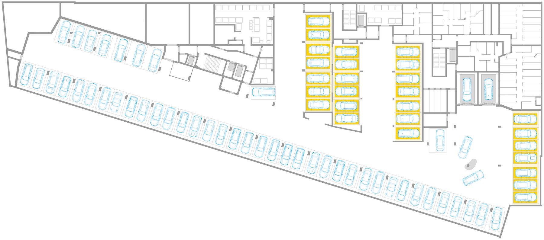 La subsol a fost construită o parcare subterană comună cu aproape 100 de locuri de parcare, accesibilă prin intermediul a două lifturi pentru mașini. Cincizeci de locuri de parcare sunt aranjate într-un mod care economisește spațiu în patru sisteme semiautomate WÖHR Combilift 551. Spațiu suplimentar este disponibil pentru partajarea autoturismelor. Raportul redus al locurilor de parcare de 0,4 per unitate rezidențială și utilizarea sistemelor compacte WÖHR susțin strategia de mobilitate durabilă a cartierului și contribuie la reducerea costurilor de construcție.