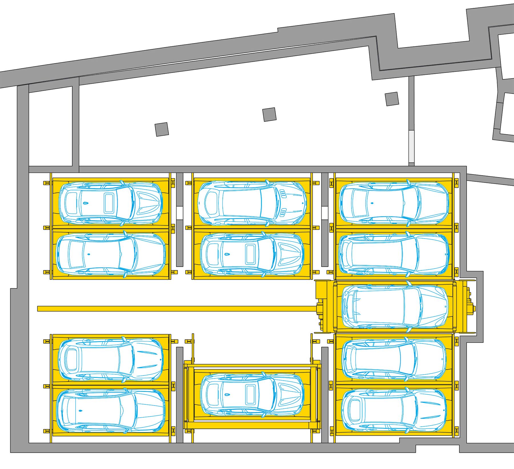 Franklinturm îndeplinește și funcții importante în spațiul public. Pe lângă rampa către garajul public de biciclete, livrările către și dinspre ShopVille din gară au loc și la parterul turnului. Sistemul de parcare adiacent „WÖHR Multiparker 740” integrează eficient 38 de locuri de parcare pentru chiriașii din clădire. Odată ce autoturismele au fost parcate în cabina de transfer, acestea sunt îndepărtate automat în termen de aprox. 139 până la 222 de secunde și parcată în depozitul cu patru etaje de la subsol. În funcție de înălțimea autoturismului, 21 de locuri de parcare până la max. 2,00 m și 17 locuri de parcare până la 1,70 m sunt disponibile pentru autoturisme cu greutatea de până la max. 3 tone. Dispozitivul de rotire la 360° din zona de transfer permite parcarea și deblocarea convenabile în sensul de mers.